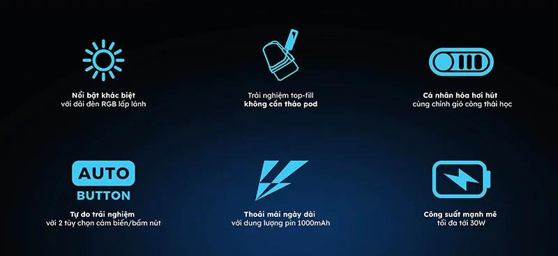 - Dải đèn RGB của Xlim Pro thực sự độc đáo, gồm 4 tùy chọn điều khiển đèn. Điều này giúp Xlim Pro trở nên nổi bật mỗi khi bạn sử dụng. Dải đèn này sẽ tự động sáng lên khi bạn hút hoặc bấm nút. Nếu bạn thấy ánh sáng quá chói khi sử dụng trong không gian tối, bạn có thể tắt hoàn toàn dải đèn này bằng cách bấm hai lần liên tiếp vào nút fire.